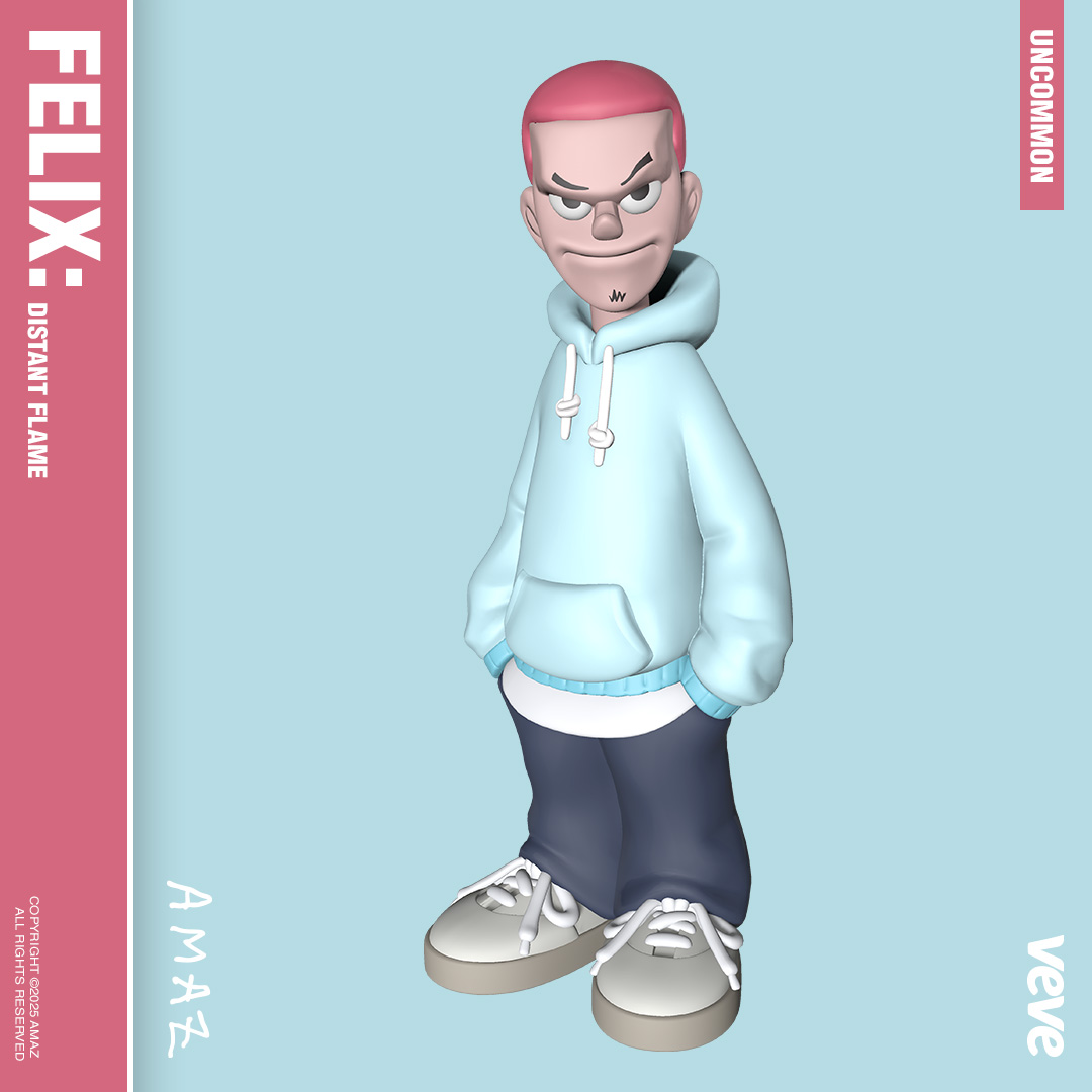 The vivid mint-colored hair and deep blue hoodie embody urban energy and youthfulness. Felix’s connection with VEVE reflects how we, too, navigate seamlessly between the physical and digital worlds, representing modern individuals who are both ubiquitous and uniquely individual.