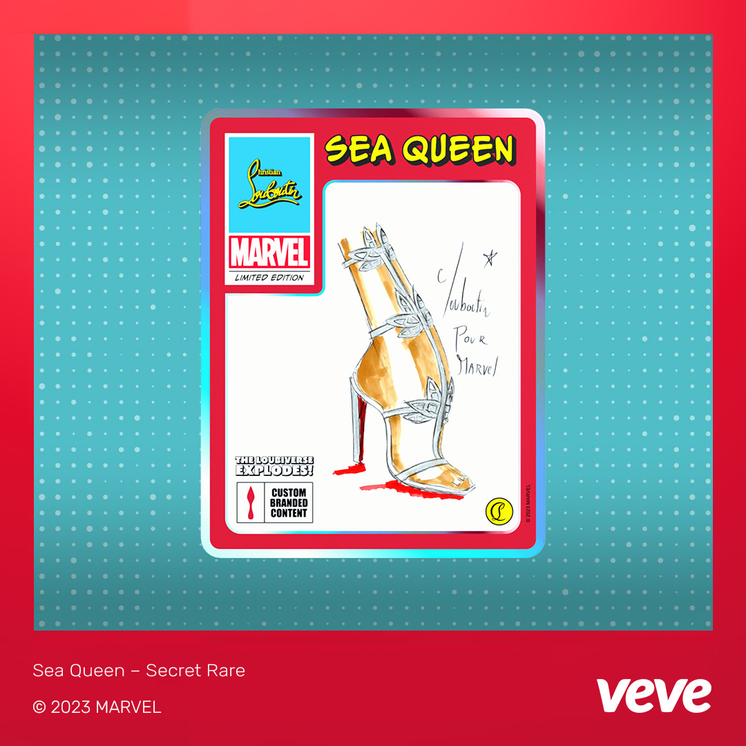Designed in honor of the collaboration between Christian Louboutin and Marvel, the Sea Queen Digital Collectible is a celebration of boldness and innovation. Featuring the strokes of Christian Louboutin’s original design, this collector’s piece proudly unveils the captivating Sea Queen shoe, a masterpiece that saw the light of day as a unique 1/1 creation, auctioned off at the launch of our collaboration.