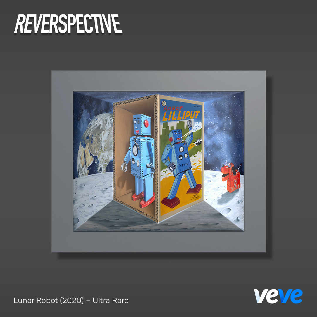 Three pieces of reverspective art: House of Cards (2019) Lunar Robot (2020) and Robotics (2021) make up Patrick Hughes’ second series for VeVe!