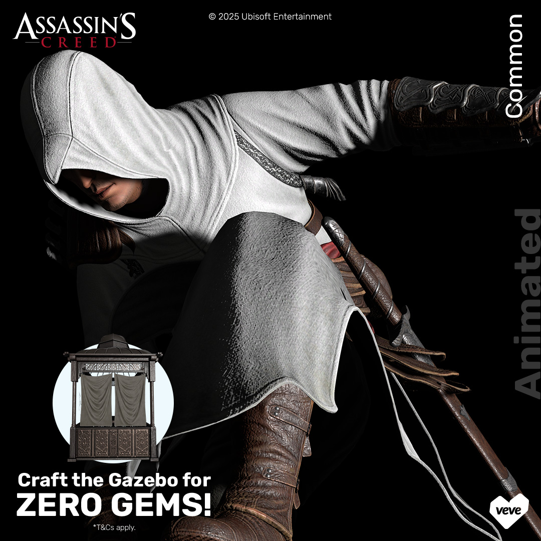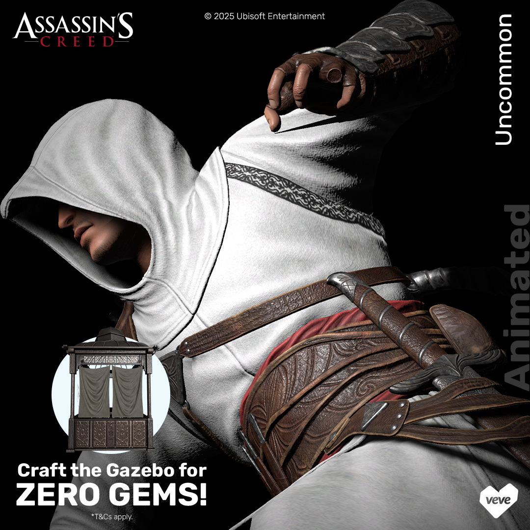To be eligible to craft the Altaïr – Gazebo 3D digital collectible, users will need to hold either the Altaïr – Crouching, Altaïr – Hidden Blade or Altaïr – Leap of Faith collectible from the Assassin’s Creed – Altaïr series. No digital collectibles will be burned during the crafting process with store purchases eligible only. The cost of this digital collectible is included in the purchase of the Assassin’s Creed – Altaïr digital collectibles. It’s first in/first served with crafting starting 25 July, 2025 at 12:00 PM PT and closing 27 October 2025 at 11:59 PM PT. All remaining Altaïr – Gazebo 3D digital collectibles will be burned after this date.