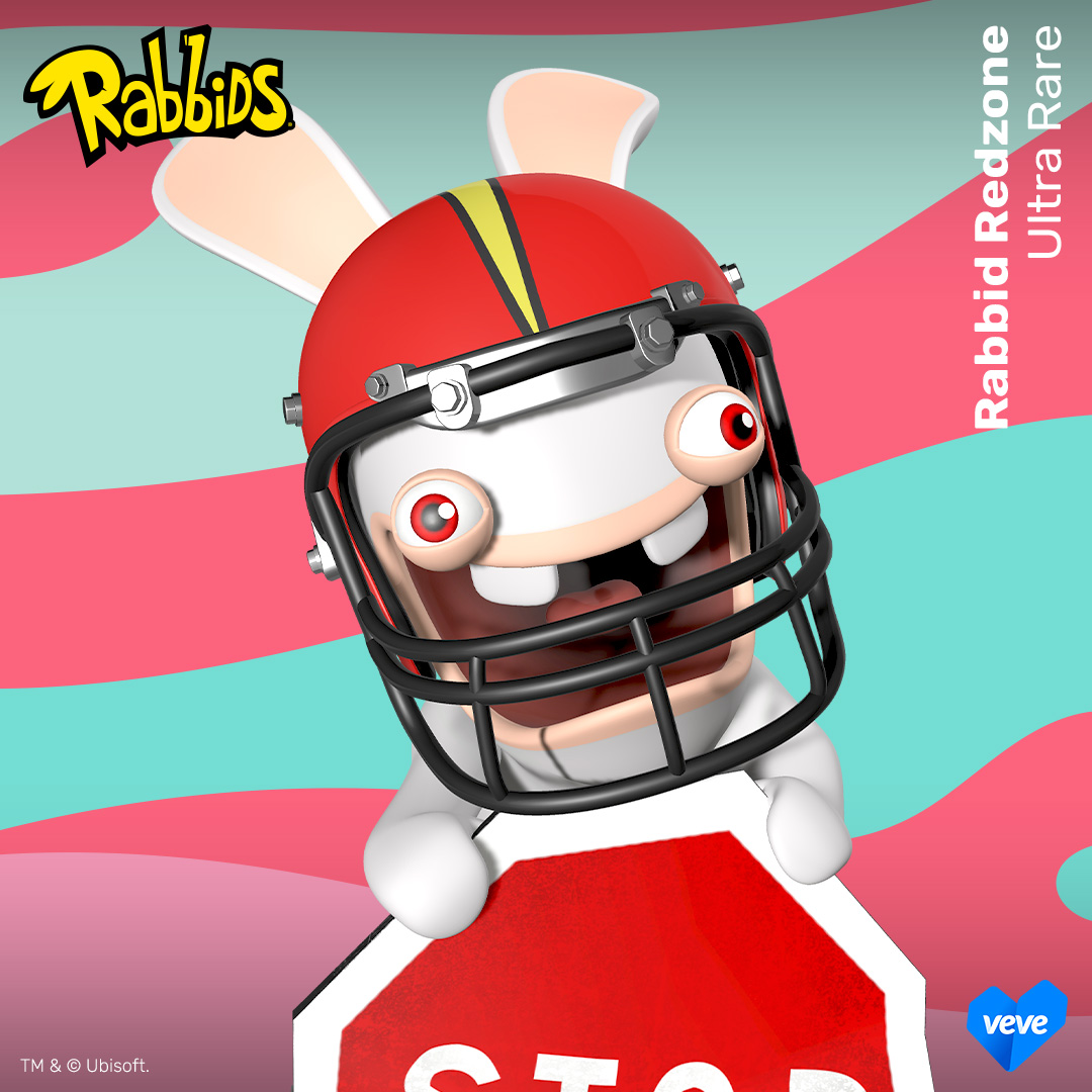 Riding a STOP sign with reckless energy, this Rabbid quarterback is all gear, no strategy. Game or gridlock, expect pure mayhem. This 3D digital collectible goes full throttle into absurdity.
