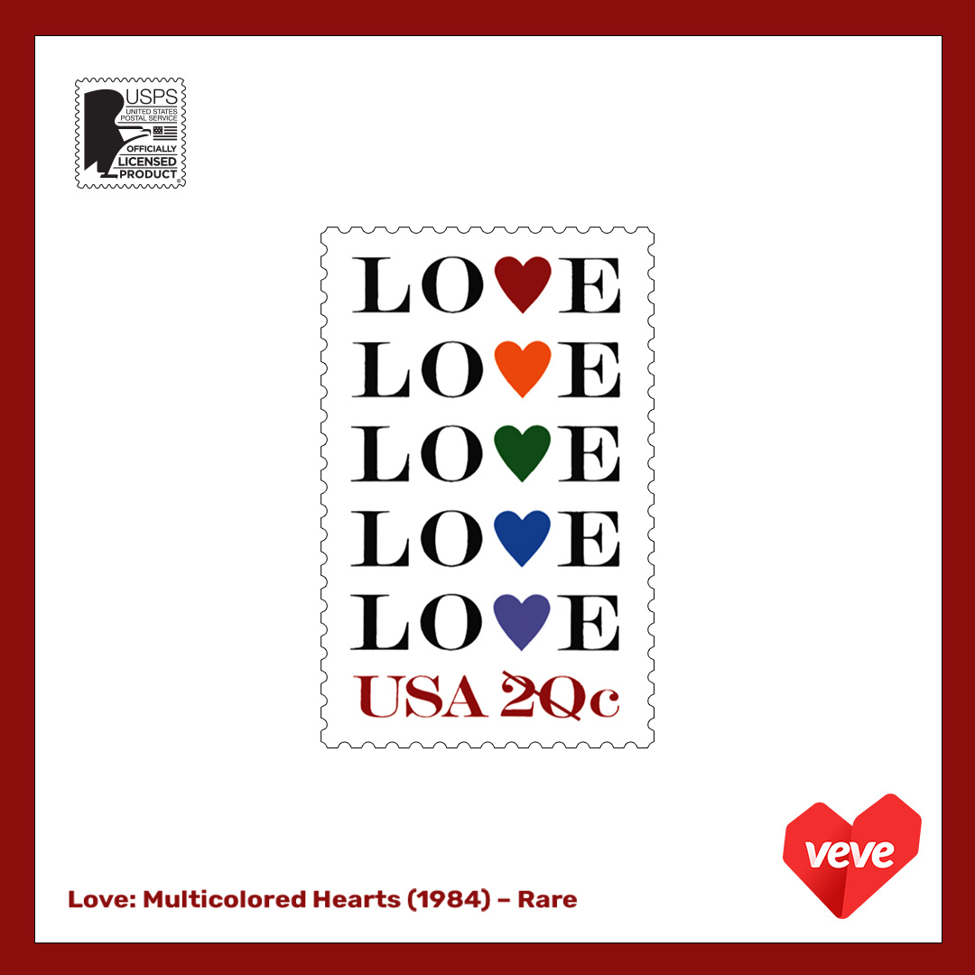 In 1984, for the third time, the U.S. Postal Service issued a special stamp honoring love. Credited for designing the 1984 Love stamp, Bradbury Thompson’s design featured a repetition of the word “LOVE” using a heart in place of the letter V, each with a different color.