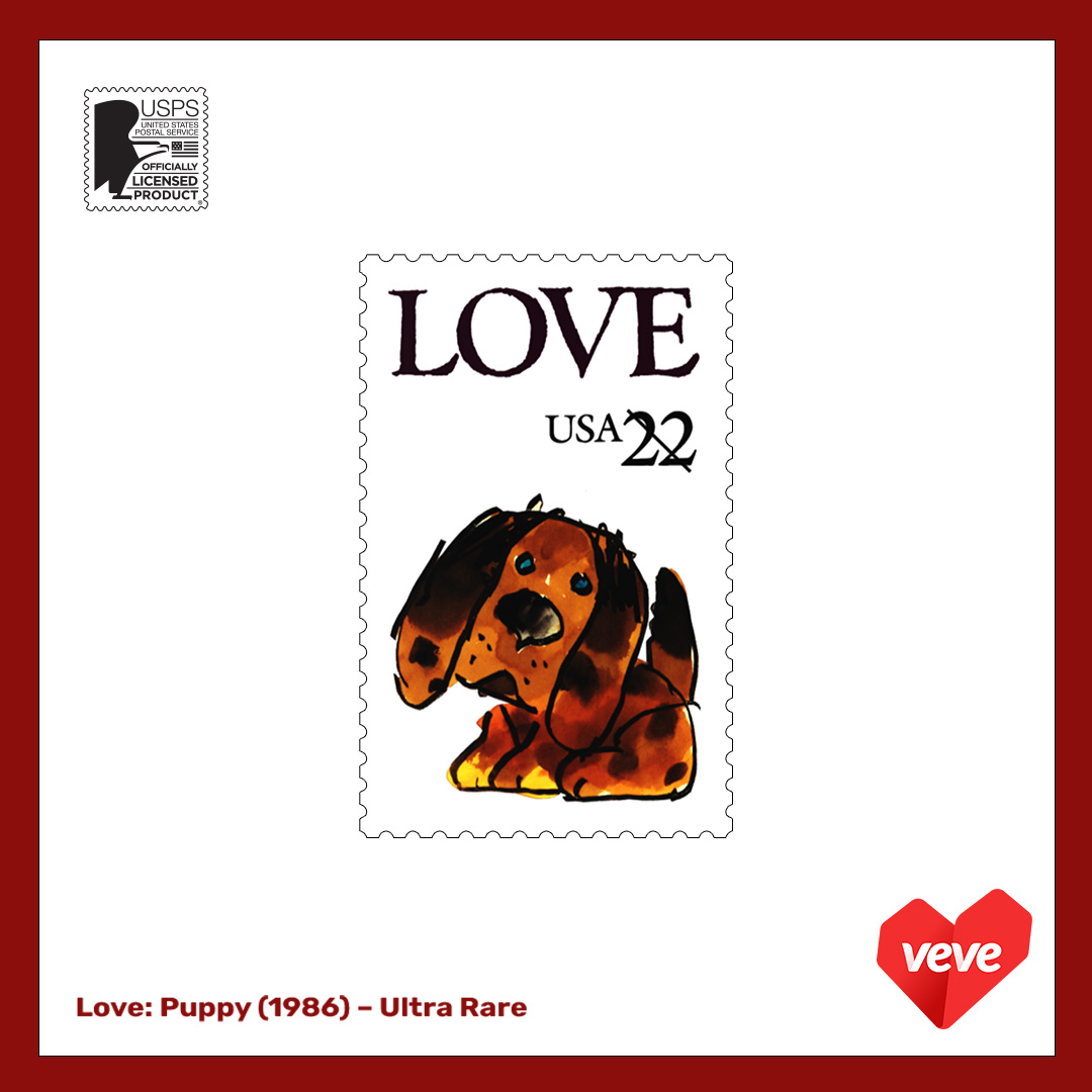 As the fifth stamp in the Postal Service’s Love series, this stamp art was originally issued on January 30, 1986, in New York City. The design captured the language of love in this vertically oriented stamp art with the depiction of a cuddly-looking puppy.