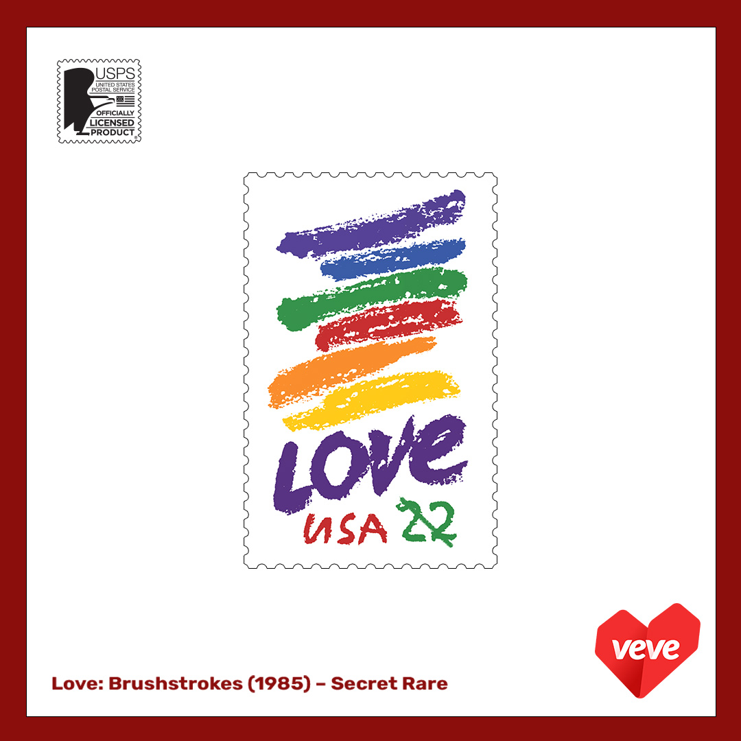 The 1985 Love stamp art includes an ink and watercolor collage of different colors to capture the elements of affection. The stamp’s contemporary design incorporates vibrant shades of six colors: yellow, orange, red, green, blue, and purple, with the word “Love” written in bold, purple letters. Created by Corita Kent, the splash of color design was very popular with the public when the stamp was originally issued.