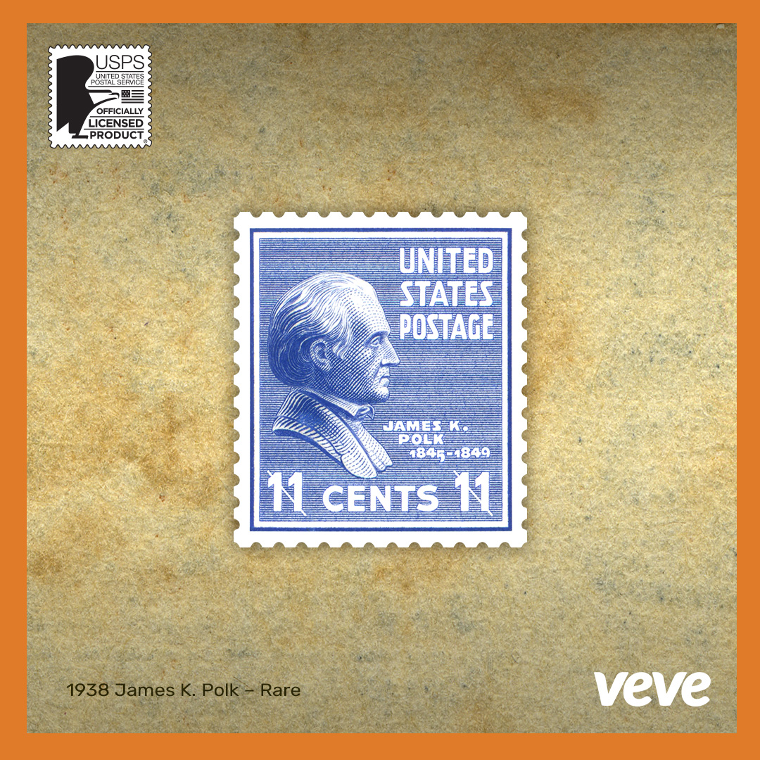 The James K. Polk stamp art features the bust profile of the eleventh U.S. president, who served from 1845-1849. Under Polk’s leadership, the U.S. acquired significant territory as part of his promise for westward expansion.