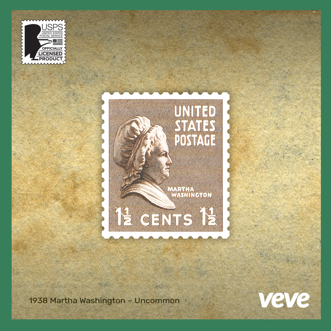 The Martha Washington stamp art features the bust profile of the inaugural First Lady of the United States.