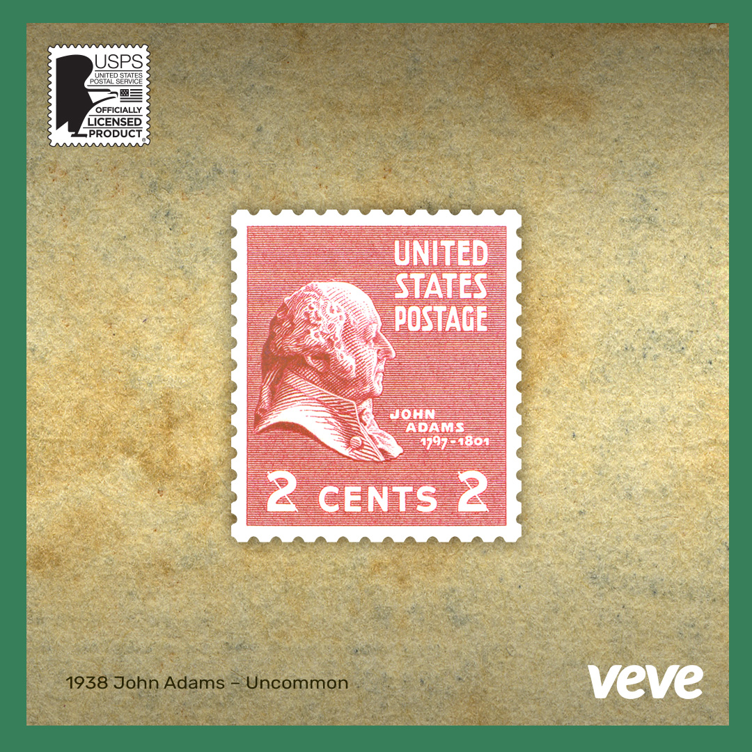 The John Adams stamp art features the bust profile of the second U.S. president, who served from 1797-1801.
