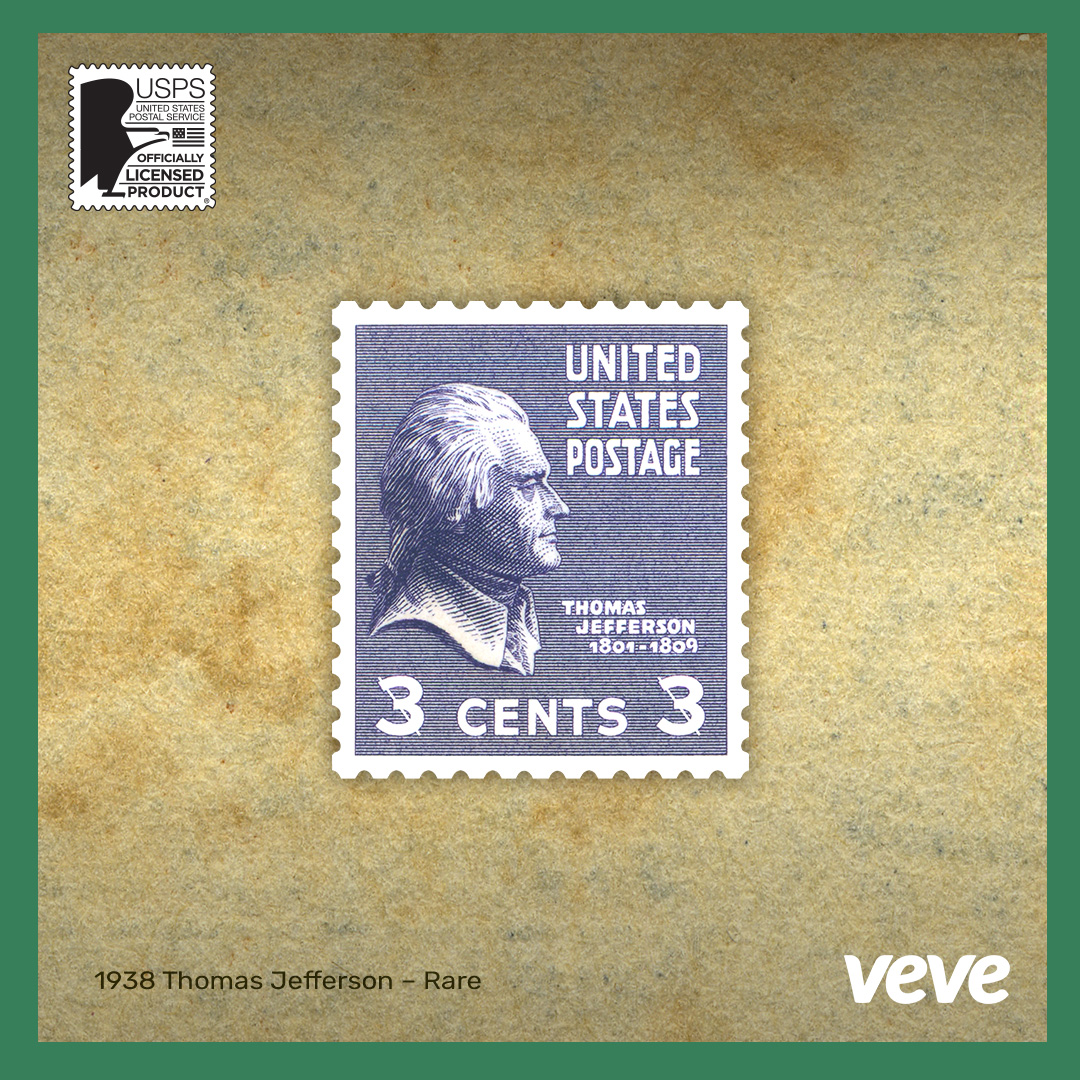 The Thomas Jefferson stamp art features the bust profile of the third U.S. president, who served from 1801-1809.