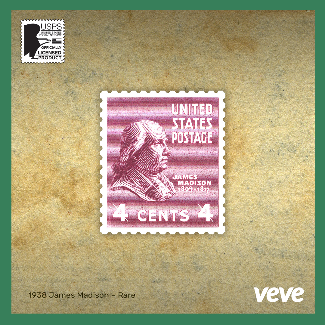 The James Madison stamp art features the bust profile of the fourth U.S. president, who served from 1809-1817.