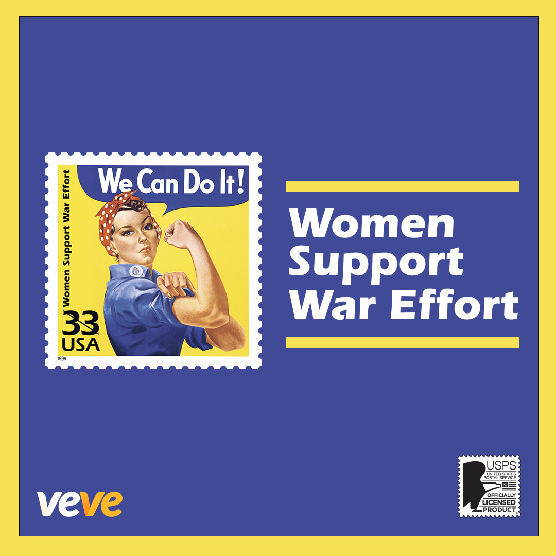 The “Women Support the War Effort” stamp highlights the important role U.S. women played during World War II. The stamp includes the “We Can Do It!” poster initially used in the early 1940s to raise morale for women in the workforce, which later gained popularity and became a cultural icon.