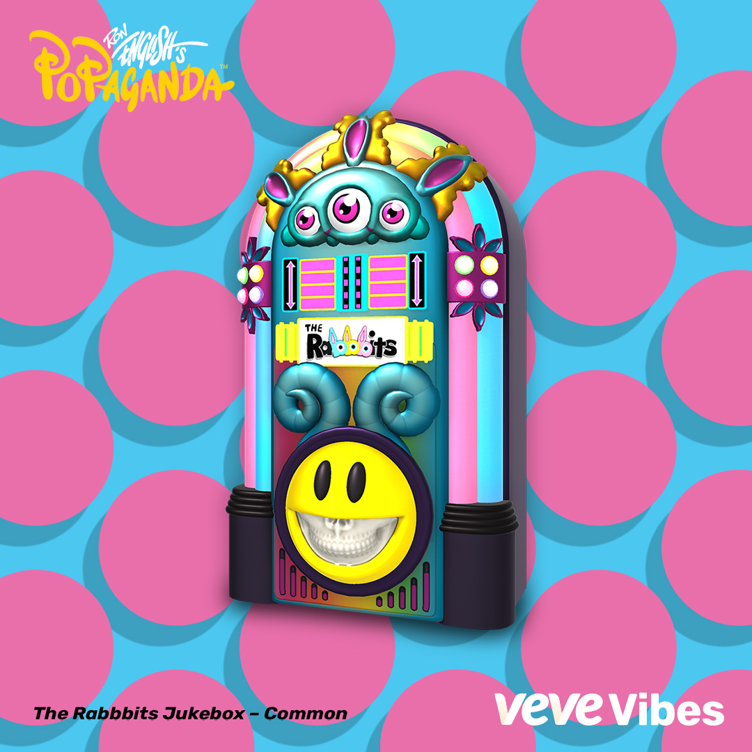 Ron English’s The Rabbbits Jukebox is a stunning piece that will light up any collection. With The Rabbbits Jukebox, fans can collect Ron English records and play them through the Jukebox for the unfolding VeVe universe. characters of Delusionville all tell their stories in song as individual single releases that are both delightful pop songs (featuring a revolving ensemble of world-class musicians) and also function as limited edition art pieces by Ron English. The singles add up to albums which tell complete unique stories from Delusionville.