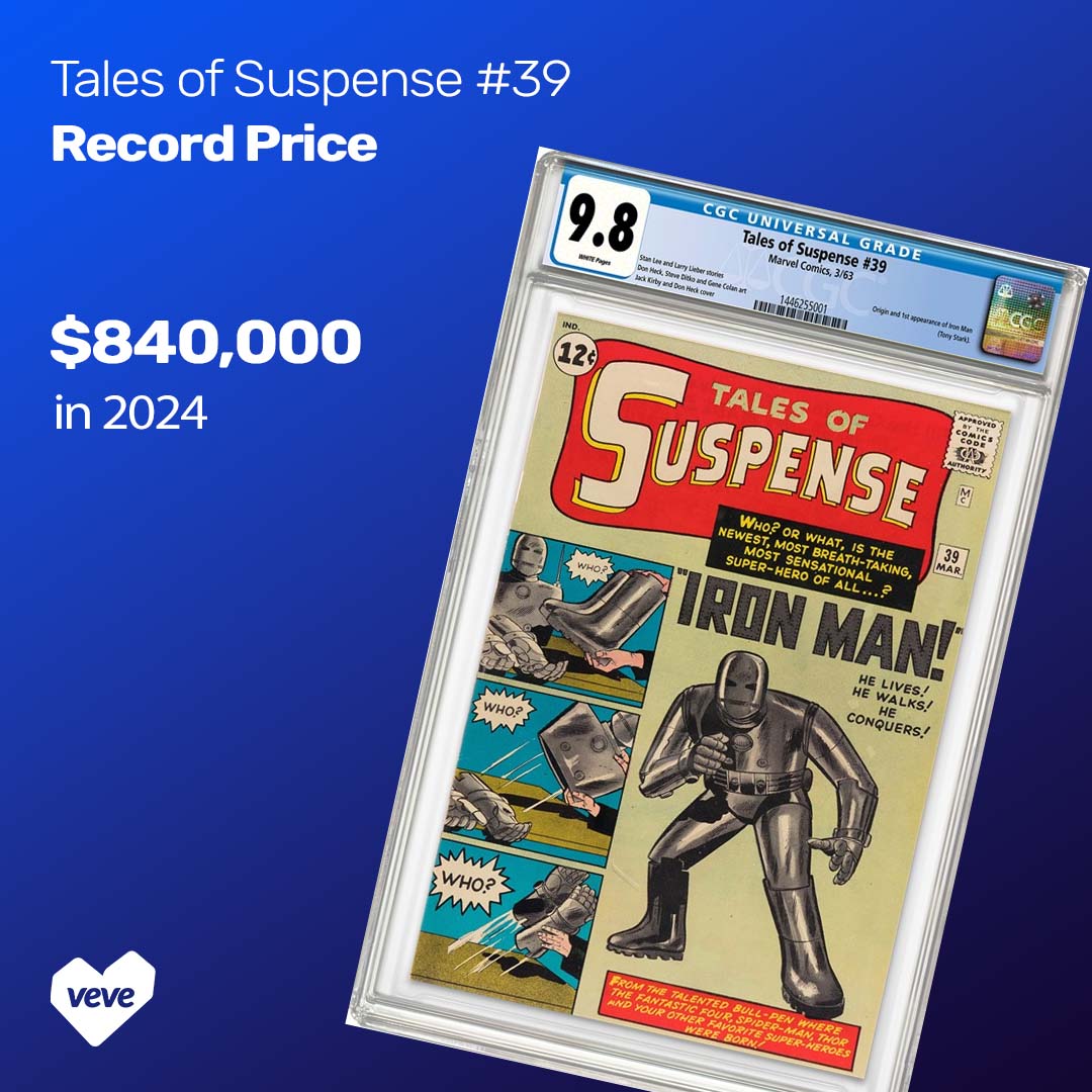 A CGC 9.8 copy of Tales of Suspense #39 sold for $840,000 in April 2024, setting a new record for Iron Man’s debut. This is the only known copy graded at 9.8, making it a true one-of-one at the top of the CGC census. Earlier sales for 9.6 copies had reached as high as $375,000, but this new benchmark reflects the rarity and rising demand for top-condition Silver Age keys.