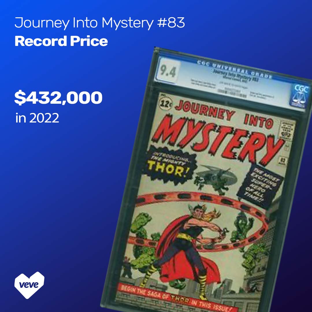 A CGC 9.4 copy of Journey Into Mystery #83 sold for $432,000 in April 2022, the highest publicly recorded price for Thor’s debut. That copy came from the Promise Collection pedigree and more than doubled the previous known record. High-grade examples are rare, and while a 9.6 may exist, none have surfaced in recent auctions.
