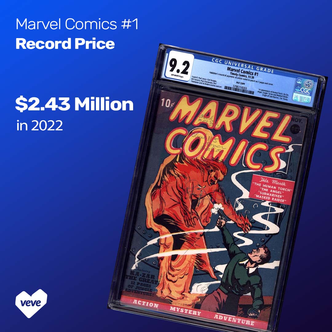 A CGC 9.2 “Pay Copy” of Marvel Comics #1 sold for $2.43 million in 2022 through ComicConnect, setting a record for the title and securing its place among the most valuable comics ever sold. That same copy previously sold for $350,000 in 2002, showing a dramatic rise in value over two decades.