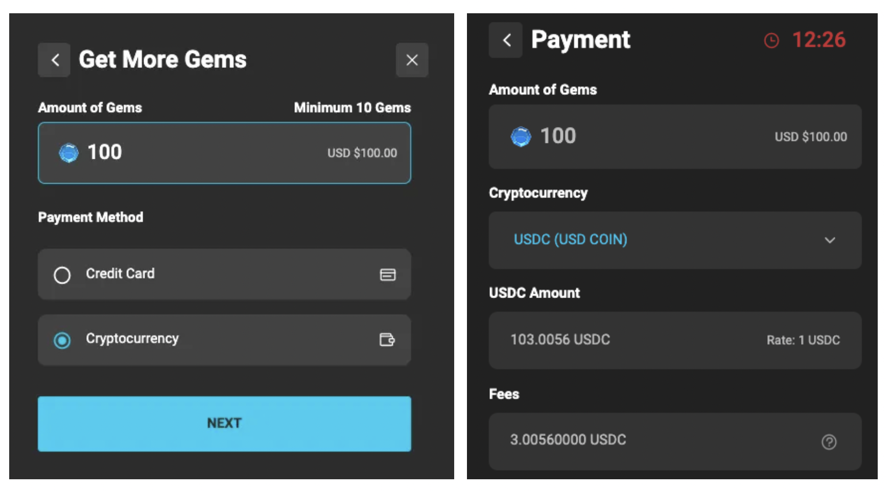 - Enter the number of Gems you wish to purchase and select ‘Cryptocurrency’ as the payment option. There is currently a $10,000 weekly limit.