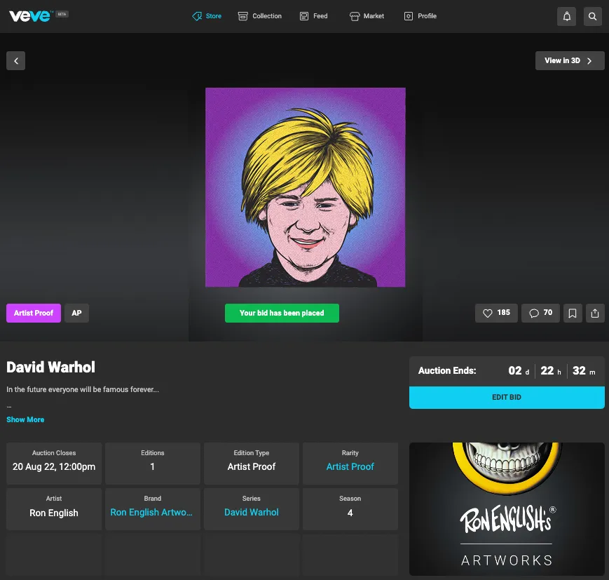 Before an Artwork auction opens you will be able to view the piece in 2D and 3D via the web app (the same way you can preview a collectible in the mobile app), as well as the associated metadata, such as the description, rarity, series, etc…