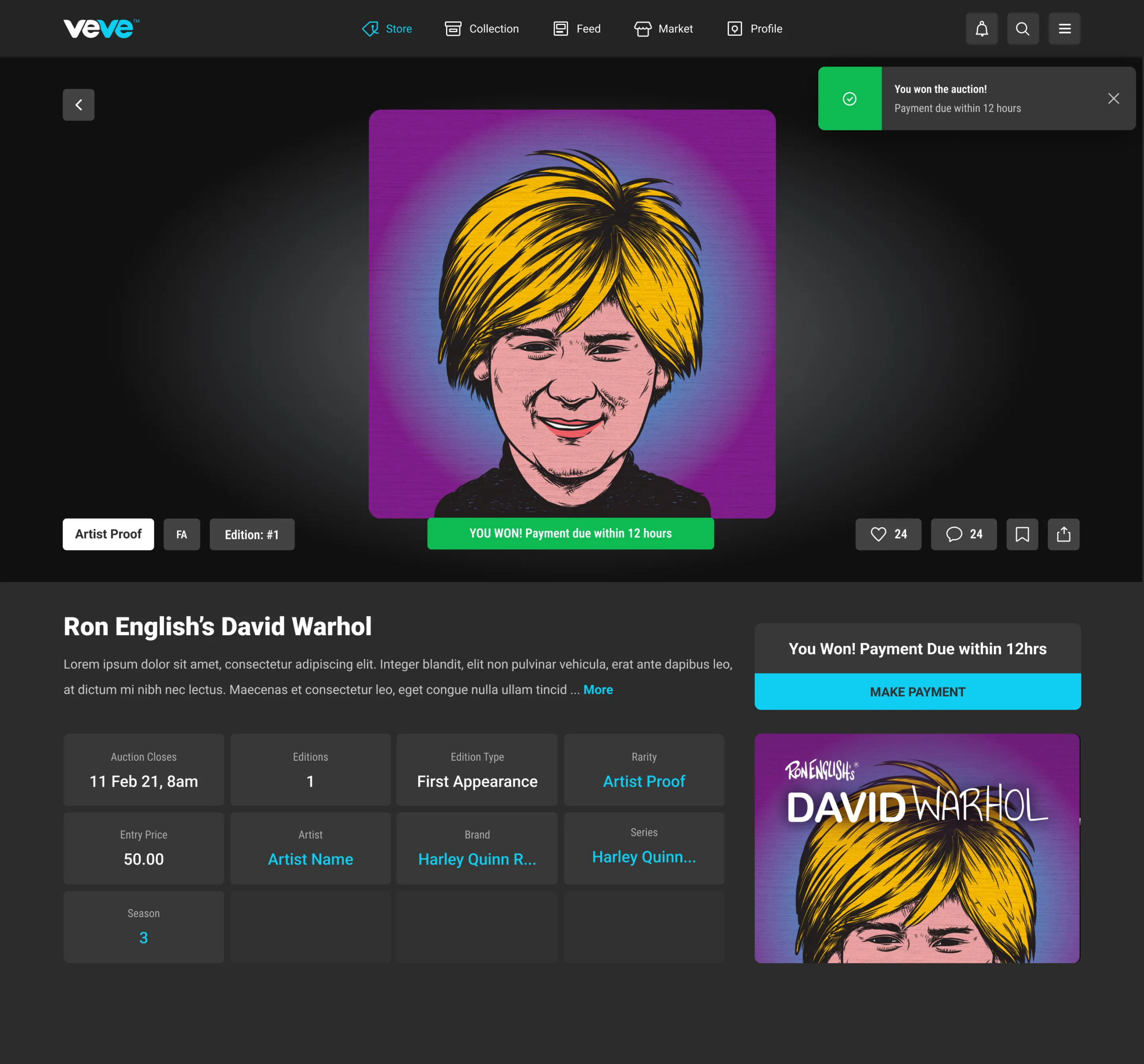 - If you are the lucky winner you will be notified in the VeVe web app and via email and will have 24 hours to pay for the auction. Non-payment will result in account restrictions. You will also be notified in the web app if you did not win the auction, but let’s be real — nobody wants to see that!