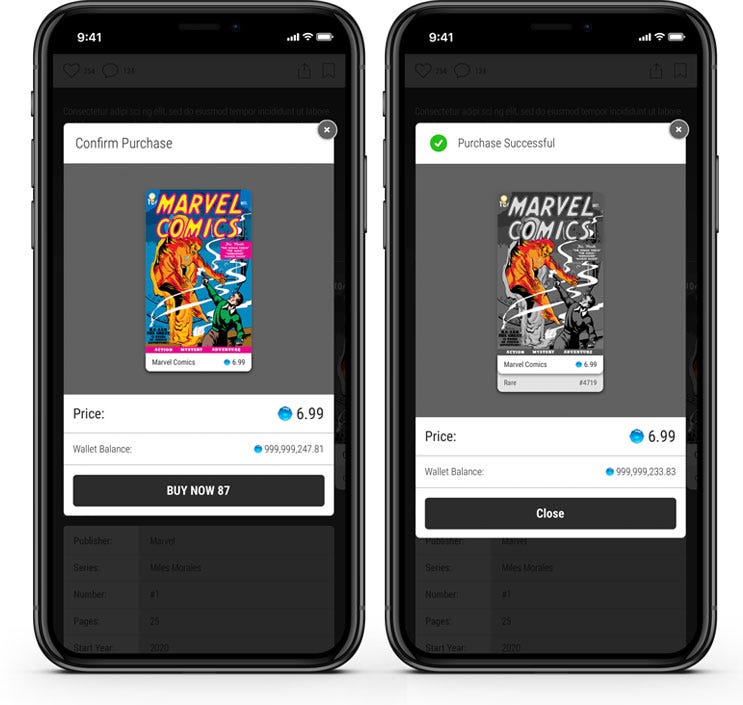When purchasing a VeVe digital comic, you won’t know which cover variant you will get until after purchase, much like VeVe Blind Boxes. The cover variant and rarity will be displayed on the Purchase Success screen. In the example below, the purchaser has secured a Rare cover variant: