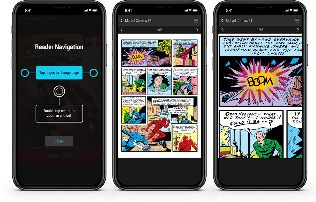 To read a digital comic, you only need to simply tap the comic cover in your collection. You can then tap on the left or right of the screen to navigate through the pages, and double-tap in the center of the screen to zoom in/out, and then drag the zoomed-in page with your finger, for an easier reading experience. If you want to zoom in further, you can pinch with two fingers.