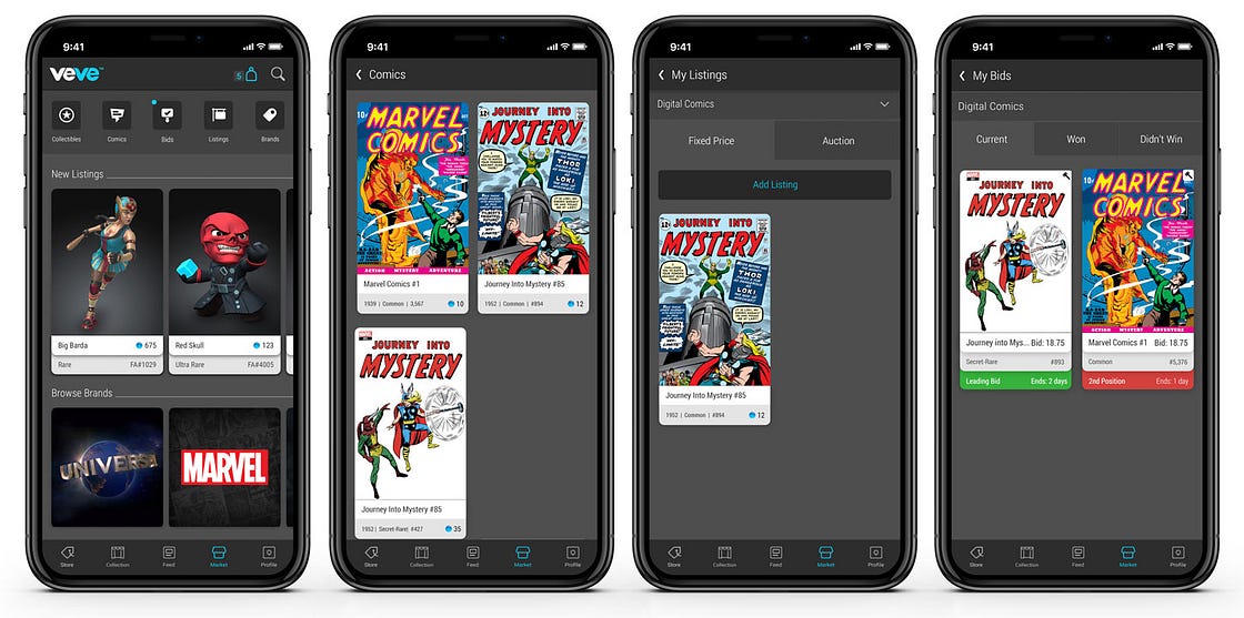 Like digital collectibles, VeVe digital comics can be purchased and sold in VeVe’s secondary market, either as a Buy Now price or Auction.