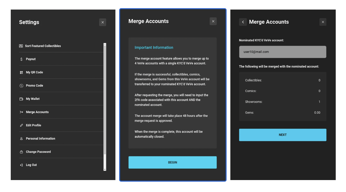 Merging accounts is a web-app-only feature, and using it, a non-KYC’d account can merge with an account that has completed the KYC process, provided the account is either your personal account (or if you are the parent or legal guardian of a child with an account under the VeVe minimum age, that child’s account).