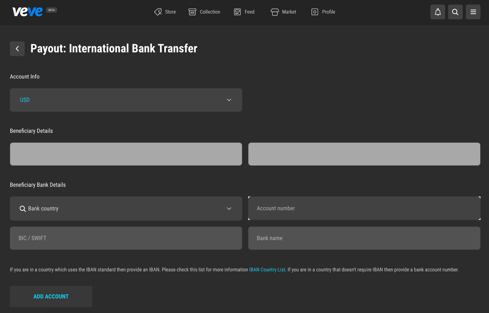 After being successfully verified, Collectors can access the payout feature on the VeVe web app, which is found on Profile > Settings > Payout