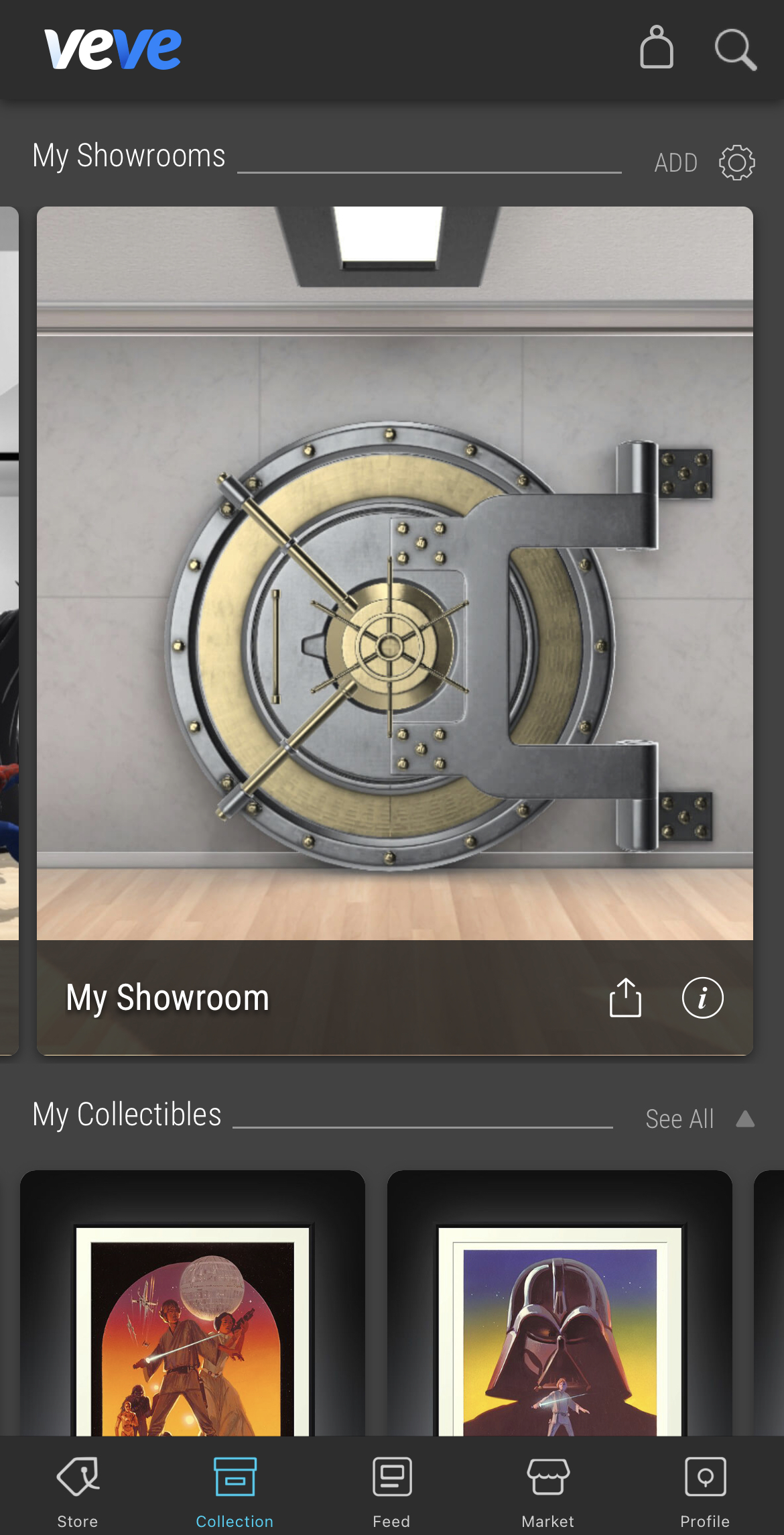 You will find your Virtual Showrooms located at the top of the Collection section in the VeVe app. You will have one Virtual Showroom by default, but you can choose to create as many as you like to showcase everything you collect.